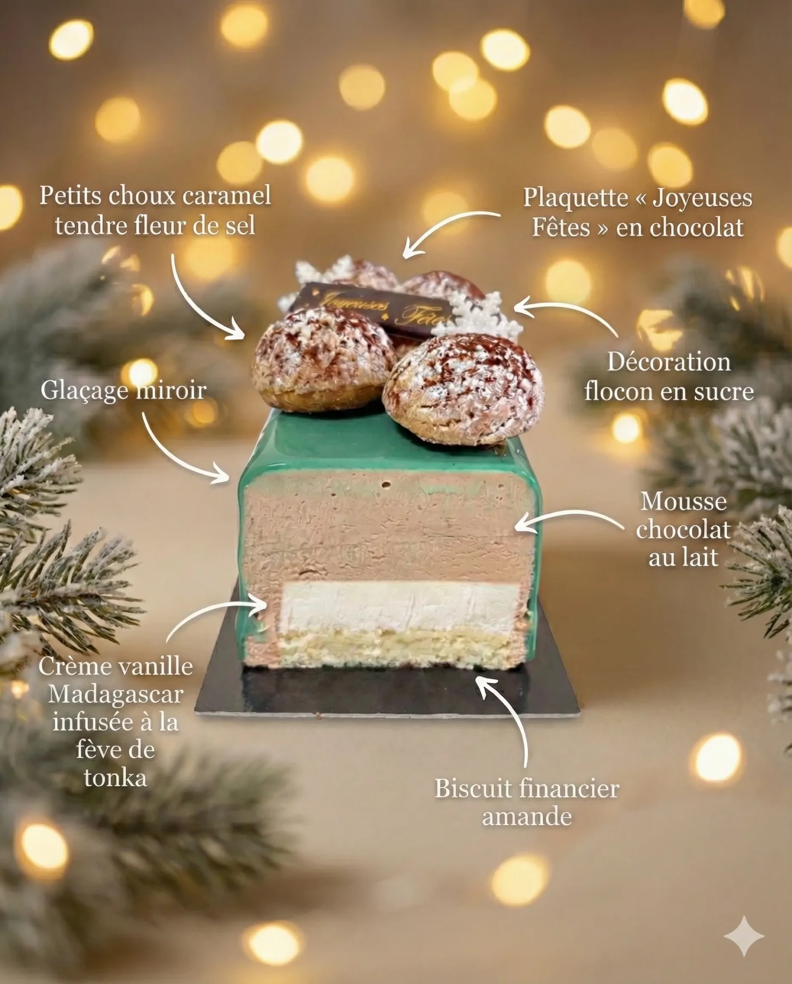 Une mousse chocolat au lait 35 %, une crème vanille infusée à la fève de tonka, un biscuit financier amande moelleux, et de petits choux au caramel en décor.
